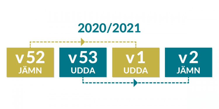 La dernière fois que nous avons eu 53 semaines, c’était en 2015 et la prochaine fois en 2026. Elle survient environ tous les six ans et c’est parce que la première semaine de l’année doit toujours compter au moins quatre jours. En règle de mémoire, on pourrait dire que la semaine 1 doit inclure un jeudi. Donc, si le jour de l’An (1/1) tombe un jeudi (ou un mercredi sur ce que cette année est bissextile), il faut ajouter une semaine supplémentaire à la fin de l’année.